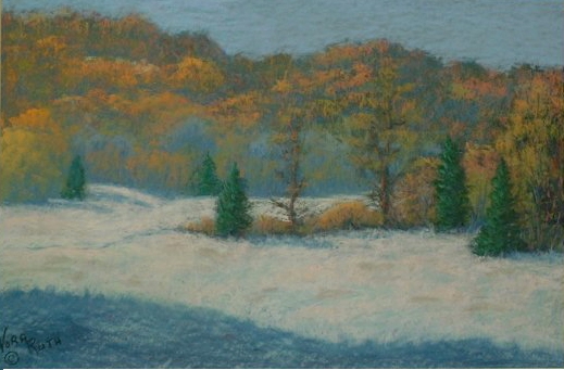 There is a valley beyond my back yard with a stream meandering down the middle which then rises to a low hill.  It is covered with hardwood trees.  This time of year the hill has on her autumn finery of gold, orange, red and rust.  The valley is a pasture where cattle graze sometimes and if I am lucky, I will see deer grazing there, too.